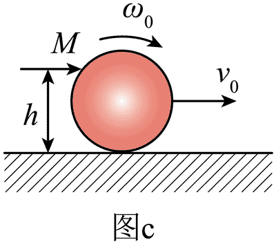 (3)如图 c,台球手在开球时用球杆击打处于静止状态的 Q 球,在极短的时间内给球上某点赋予一个水平冲量 M,该点在竖直大球面高度 h 处,M 的方向在过该点的竖直大球面内,使得作用后小球获得质心速度 v0(沿图 b 的 y 方向),以及转 动角速度 ω0,当 h 取特定值时,可使得 Q 球无滑滚动飞向 T 球。求此特定值。
