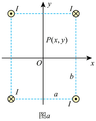 (1)利用磁阱囚禁原子的一种常见装置是所谓 Ioffe 势阱。Ioffe 势阱由四根横截面积可忽略、相互平行的无限长直导线组成。这四根导线垂直穿过一边长为 a 和 b 的长方形的四个顶点。导线中通以大小相同的电流 I,电流方向如图 a 所示。以长方形中心 O 点为原点,垂直于长度分别为 b、a 的边的直线为 x,y 轴,建立右手直角坐标系,任取 x – y 平面上原点附近一点 P,其坐标为(x,y,0)(x ≪ a,y ≪ b,a 和 b 为同阶量),求 O、P 两点的磁感应强度;所得结果如果可做小量近似的,试将所得结果做小量近似并保留至领头阶。