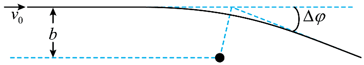 (3)设一物体以速度 v0 从外太空飞入太阳系,朝向太阳的瞄准距离是 b(即初速度 v0 所在直线到太阳中心的距离),如图所示。设 \(\frac{{v_0^2b}}{{G{M_ \odot }}}\) ≫ 1,其中 M⊙ 是太阳质量。当它飞离太阳系时,对下述两种情况,求其飞出方向相对于原飞入方向的偏转角 Δφ;