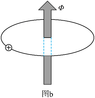 (2)在环中通入磁通 Φ(Φ 关于过圆心且垂直于圆面的轴对称,图中箭头表示磁通的正负。在本题的计算中,Φ 视为连续变量),如图 b 所示。此时电子的动量变为