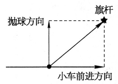 应在小车尚未到达旗杆正前方之前抛出小球;且需控制好抛出的速度大小,使小球的水平(合)运动恰好对着旗杆。见图。