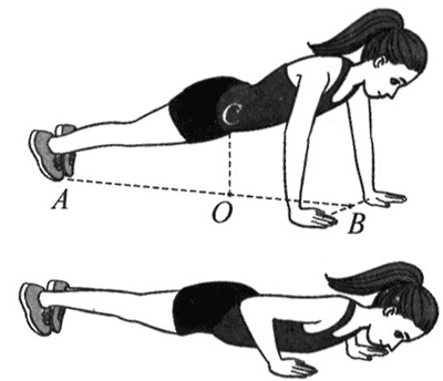16.如图所示,质量为 60 kg 的某运动员在做俯卧撑运动。运动过程中可将她的身体视为一根直棒,已知重心在 C 点,C 在地面上的投影 O 与两脚、两手连线中点间的距离 OA、OB 分别为 0.9 m 和 0.6 m。若已知运动员在 1 min 内做了 30 个俯卧撑,每次肩部上升的距离均为 0.4 m,g 取10 m/s2,则她克服重力做功的平均功率为_______W。
