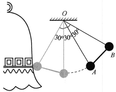 48.如图所示,两个质量均为 m 的重锤用不计质量的细杆 AB 连接,轻绳长度 OA = OB = L,它们之间的夹角为 30°。开始时OA偏离竖直方向 30° 由静止开始下落。当左边的重锤碰到钟时,右边的重锤恰好在最低点,即 OB 恰好在竖直方向。求重锤碰到钟时的速度大小。