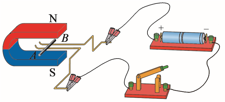 12.如图所示,阴极射线管(A 为阴极)放在蹄形磁体的 N、S 两极间,阴极射线管的 A、B 两端分别通过导线连接到直流高压电源的哪个电极?若无磁体,电子的运动方向如何?磁体如图示情境放置,电子束运动轨迹的偏转情况如何?