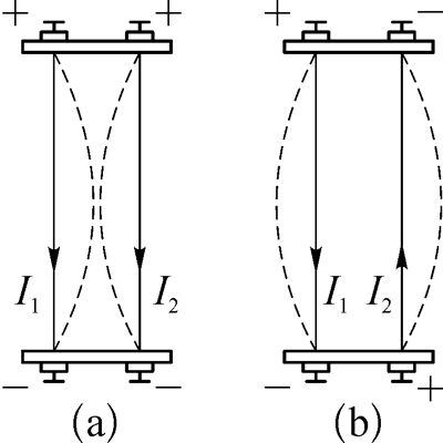 两根通电平行直导线间存在相互作用力;同方向电流间相互吸引,反方向电流间相互排斥。(虚线:同方向电流向内侧形变,反方向电流向外侧形变,如图所示)