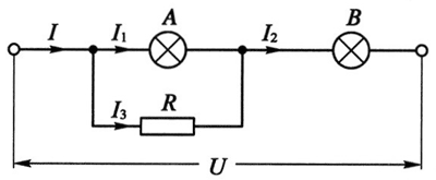 因为两小灯泡的额定电压之和恰好等于电源的输出电压,但两小灯泡的额定电流不相等,只要灯泡 A 与一电阻 R 并联后再与灯泡 B 串联,使灯泡 A 分去 0.2 A 的电流即可,如图所示。
