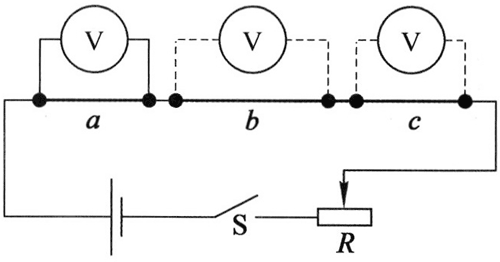 15.某同学为了探究某种导体的电阻与其影响因素的关系,设计了如图所示的电路图:将长度、横截面积各不相同的相同材料的电阻丝 a、b、c 串联后接入电路,并用电压传感器分别接在 a、b、c 两端。