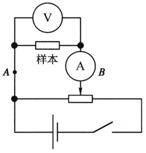 A、B 间的电路连接如图所示。调节滑动变阻器阻值,记录样本两端的电压及流过的电流,计算出电阻阻值。处理数据时可以采用多次测量取平均值的方法,或者绘制 U – I 图像。