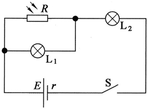 光照强度逐渐增大,R 阻值逐渐变小,则其与 L1 并联的总阻值变小,根据闭合电路欧姆定律,干路电流变大,内电压变大,L2 两端电压变大,L2 逐渐变亮,L1 与电阻 R 的并联电压减小,L1 逐渐变暗。