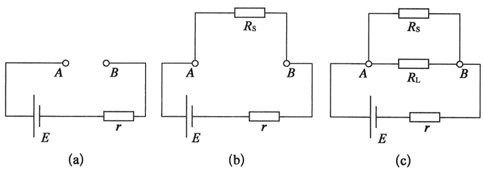 当旧电池接入负载电阻 RL 时,等效线路如图(c)所示。设 RL 远小于电池内阻 r,A、B 间电压很小,在 RL 极小时接近零。因此,在 RL 极小时电压传感器示数接近零。如负载阻值 RL 介于以上两种情形(空载也可视为负载阻值 RL 为 ∞)之间,电压传感器示数便介于零和电动势 E 之间。可见,电池空载时电压传感器示数接近电池电动势 E 的标称值;接入负载电阻时,电压传感器测得电池两极间的电压介于零和电池电动势的标称值之间,视负载电阻 RL 的阻值而定。