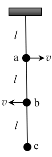 3.三个质量皆为 m 的小球 a、b、c 由三段长度皆为 l 的不可伸长的轻细线 L1、L2、L3 相继连接,竖直悬挂,并处于静止状态,如图所示。在某一时刻,小球 a、b 受到水平方向的冲击,分别获得向右、向左的大小为 v 的速度。此时,中间那段细线 L2 的张力大小为( )