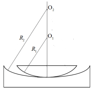 11.如图所示,将待测凸透镜放在一个标准件(平凹透镜)上.用波长为 λ 的单色平行光垂直(即垂直于平凸透镜的上平面)傍轴照射,构成一套平凸-平凹内切结构的干涉装置;其中 R1、R2(R2 > R1)分别为两内切球面透镜的曲率半径。
