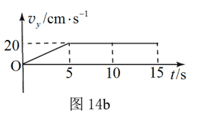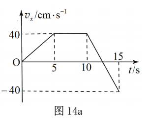 14.一质量为 M = 1 000 kg 的封闭车厢在水平地面上运动.车厢内底面水平.车厢内一乘客试通过车厢内的实验来研究车厢在水平地面上的运动。他在车厢底面上建立与底面固连的平面直角坐标系(xOy 系),并在坐标原点 O 放置一质量为 m = 5.0 kg 的物块 A。在 t = 0 时,A 从静止开始运动。在 0 ≤ t ≤ 15 s 时间段内,A 在 xOy 系中 x、y 方向上的速度 vx、vy 与时间 t 的关系分别如图 a、b 所示。已知物块 A 与车厢内底面之间滑动摩擦系数为 μ = 0.20,重力加速度大小 g = 10 m/s2。