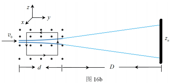 (3)小圆形环电流在同样的梯度磁场中受力与矩形环电流满足同样规律。如图 b 所示,水平速度为 v0 的氢原子通过同样的沿 z 方向均匀变化的梯度磁场,磁场区宽度为 d,出磁场区以后打到距离磁场区为 D 的竖直接收屏上。假如磁场始终垂直于环电流平面,求环电流顺时针方向的原子与逆时针方向的原子击打在接收屏上位置在 z 方向的距离 zn。