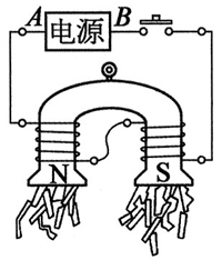 12.为了避免电磁起重机的线圈突然断电使被吸的铁块下落引起事故,设计了一种用蹄形永磁体制成的电磁起重机,它在切断线圈电流时能将铁块吸住,接通线圈电流时铁块便能脱落。当该电磁起重机的线圈接通电流后,通过线圈的电流产生的磁场与永磁体原来的磁场方向____________(选填”相同”或”相反”)。若蹄形永磁体的左端为 N 极,则根据蹄形永磁体两臂所绕线圈的绕向,如图所示,可断定A端为电源的___________(选填”正”或”负”)极。