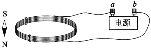 a 为正极,b 为负极。通电线圈内、外的磁场方向相反,线圈外小磁针 N 极指向下方,说明线圈内的磁场方向指向上方,根据“右手螺旋定则”判断电流的方向从 a 端流进线圈,所以 a 端为电源的正极。202