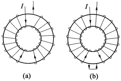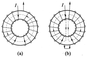 17.图(a)和(b)为两种绕线方向不同的环状螺线管的示意图,其中图(b)是由两个匝数相同、互相对称的半圆环形螺线管串联而成。当接通图示方向的电流后,试分别画出磁感线分布情况的示意图。