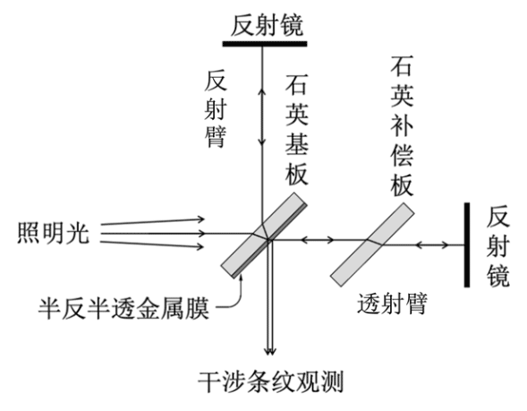 照明光为单色激光,入射光经过半反半透的镜子分为沿干涉仪的两个臂(反射臂和透射臂)传播的两束光。半反半透镜与入射光轴方向之间的夹角为 45°,反射臂和透射臂相互垂直。在两个臂端上各放置与相应的臂垂直的反射镜,反射镜可以沿臂的方向移动。反射和透射光线经反射镜反射,再次经过半反半透镜透射和反射,两束光在空间重叠,发生干涉。如果照明光为发散光源,我们观察到的干涉条纹为同心圆环。半反半透镜是在一个平整的石英基板上蒸镀一层薄金属膜制成,迈克尔逊干涉仪中参与叠加的两束光都经过半反半透镜的反射,一束光是在石英和金属界面上的反射,另一束光是在空气和金属界面上的反射。因为反射界面不同,所以两束光反射时相位突变不同,两者的差异为 Δφ,下面我们通过实验测量 Δφ。开始时,观察到干涉场中心是亮斑,干涉场最外侧是亮圆环,一共 20 个亮条纹(计及中心亮斑)。现在缓慢调节一个臂的反射镜,让反射镜沿臂的方向平移,观察到干涉条纹发生明暗变化,并发现同心圆环条纹越来越稀疏。干涉场中心明暗变化了 23 个周期,干涉场最外侧的明暗变化了 20 个周期。(本题中,条纹数目均视为精确计数值,干涉仪两臂的长度在 cm 量级。)