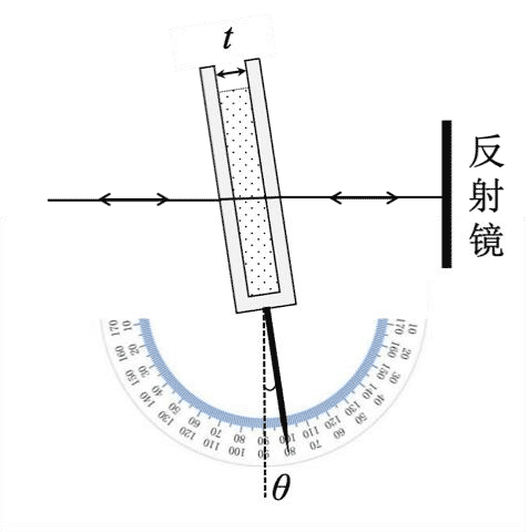 (3)使用此干涉仪测量某一透明液体的折射率,将扁平的石英空槽插入迈克尔逊干涉仪的一个臂,使得石英槽的表面与臂的方向垂直。然后调节石英槽与臂之间的夹角,使之改变 θ = 5.00°;在角度改变过程中,干涉场中心明暗变化了 10 个周期。现将待测液体注入石英槽,如图 1b 所示。再次调节石英槽的倾斜角度,使其恢复到与臂垂直,在此过程中,干涉场中心明暗变化了 17 个周期。已知照明光波长为 633 nm ,石英槽内壁间距为 t = 2.00 mm,空气的折射率为 1.00。求待测液体的折射率。