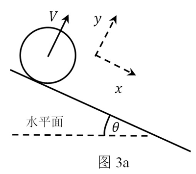3.如图 3a,将质量为 m、半径为 R 的匀质实心球从倾角为 θ 的无限长固定斜面上发射,已知球心初速度垂直于斜面,大小为 V,球初始的自转角速度为零。为方便描述实心球此后的运动,在斜面参考系中建立如图 3a 所示的平面直角坐标系,其中 x 轴沿斜面向下,y 轴垂直于斜面向上。假设球与斜面的碰撞是弹性的,碰撞时间极短,且碰撞前、后的瞬间球垂直于斜面的速度大小不变。进一步假设斜面足够粗糙,以至于在球与斜面的碰撞过程中,其间摩擦力足够大、接触点无相对滑动。已知球绕其直径的转动惯量为 I = \(\frac{2}{5}\)mR2,求