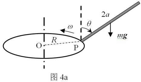 4.如图 4a,一根长度为 2a、质量为 m 的匀质刚性细杆,其一端有一小孔,嵌套在半径为 R 的水平圆环的 P 点处( P 是圆环上的固定点);P 点(连同杆)随圆环一起绕圆环中心轴以恒定角速度 ω 转动;同时,杆可绕 P 点无摩擦地转动,且杆和圆环矢径 OP 始终在同一竖直平面内;杆与竖直方向之间夹角为 θ。重力加速度大小为 g。