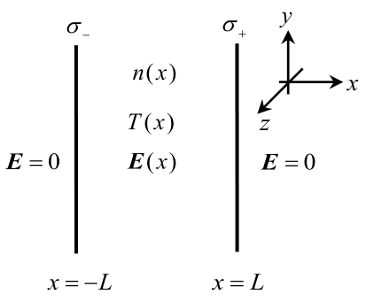 6.金属内部有温度梯度时可以在其两端产生电动势,该效应被应用于热电偶温度计等。为了分析此现象,现建立一个简单的经典玩具模型,如图 6a 所示:一厚度为 2L、沿着 y、z 方向无限延展的金属平板,位于 – L < x < L 区域;而 | x | > L 区域为真空,电场为零。将金属内的导电电子视为在空间均匀的正电荷背景上运动的经典理想气体。没有温度梯度时,呈电中性的金属内部的电子是完全均匀分布的,其数密度为 n0;有温度梯度时,金属内的温度是 x 的函数,T(x) = T0 + δT(x),且 | δT(x) | ≪ T0。在(局域)热平衡状态下,金属内电子数密度 n(x) = n0 + δn(x) 会略微偏离 n0,| δn(x) | ≪ n0。金属内部也会有很小的沿 x 方向的电场 Ex(x)。金属表面 x = ±L 内侧也分别有很小的面电荷密度 σ + 和 σ −。已知电子质量为 m,所带电荷为 − e(e > 0)。忽略重力,玻尔兹曼常量为 kB。