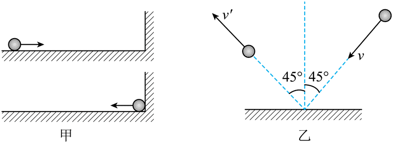 (3)如图乙,一个质量为 m 的钢球,以速度 v 斜射到水平放置的坚硬石板上,入射角是45°。碰撞后被斜着弹出,弹出的角度也是 45°,速度变为 vʹ,且其大小与 v 的大小相同。用作图的方法求钢球动量的变化量。