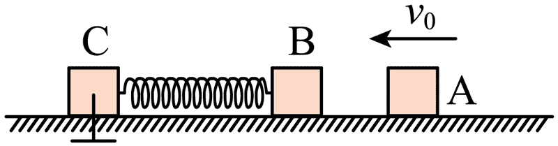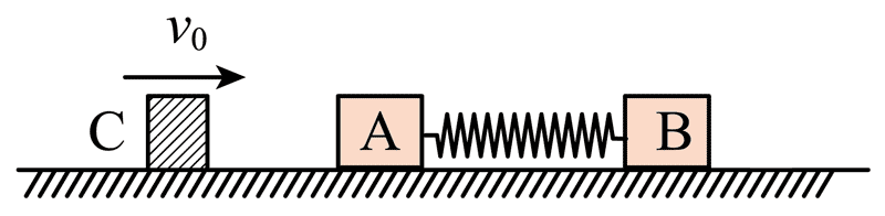 140.如图,铁块 A 的质量 mA = 3 kg,木块 B 的质量 mB = 1 kg,一轻质弹簧连接铁块 A 和木块 B,与铁块 A 不栓接,两物块静止在光滑的水平面上。质量 mC =2 kg 的磁性金属块 C 以水平速度 v0 = 15 m/s 向铁块 A 运动,相碰后粘在一起。求: