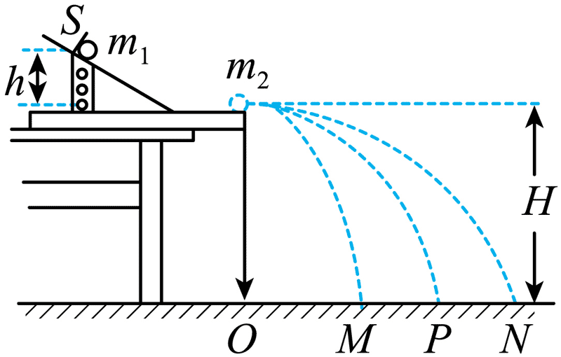 ⑥ 记录 b 落在斜面上的点 M,用刻度尺测出其到桌面边缘 O 的距离为 s0;