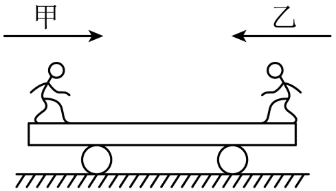 149.如图,甲、乙两人各站在静止小车的左右两端,当他俩同时相向行走时,发现小车向右运动。下列说法不正确的是(车与地面之间无摩擦)( )
