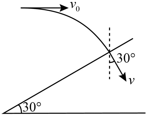 156.如图,一质量为 m 的小球,以初速度 v0 沿水平方向射出,恰好垂直地射到一倾角为 30° 的固定斜面上,并立即反方向弹回。已知反弹速度的大小是入射速度大小的 \(\frac{3}{4}\),则碰撞中斜面对小球的冲量大小为__________,方向__________。