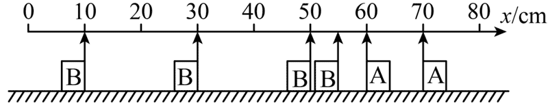④ 把 A、B 两滑块放到导轨上,并给它们一个初速度,同时开始闪光照相,闪光的时间间隔设定为 Δt = 0.2 s。照片如图所示,该组同学结合实验过程和图像分析知:该图像是闪光 4 次摄得的照片,在这 4 次闪光的瞬间,A、B 两滑块均在 0 ~ 80 cm 刻度范围内;第一次闪光时,滑块 B 恰好通过 x = 55 cm 处,滑块 A 恰好通过 x = 70 cm 处,碰撞后其中一个滑块处于静止状态。