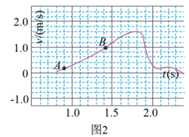 (2)测定加速度,通过位移传感器获得小车运动的 v – t 图像,小车在 AB 区域内可视为________运动,如图 2,A 点速度为 0.200 m/s,B 点速度为 0.909 m/s,时间差为 0.411 s,此区域内小车的加速度 a = _______m/s2,位移为_________m(小数点后保留3位数字)。