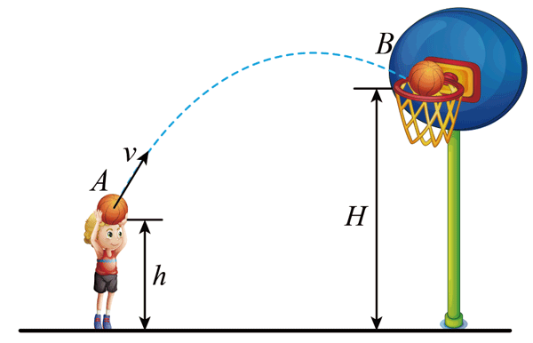 4.如图,将质量为 m 的篮球从离地高度为 h 的 A 处,以初始速度 v 抛出,篮球恰能进入高度为 H 的篮圈。不计空气阻力和篮球转动的影响,经过篮球入圈位置 B 的水平面为零势能面,重力加速度为 g。则篮球经过位置 B 时的机械能为( )