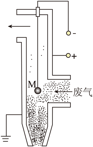 3.在 M 与外壳之间建立电场后,M 附近的电场____________(选填“最强”或“最弱”),周围空气分子被电离为电子和正离子,____________在奔向外壳的过程中遇到尘粒,使尘粒带电,被吸附到外壳,积累到一定程度后,在重力的作用下落入集尘器。