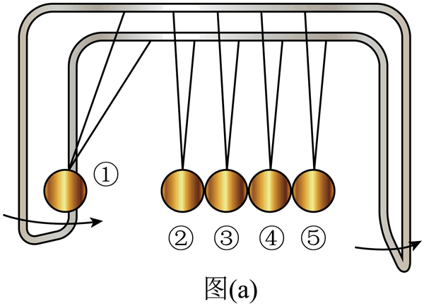 7.某同学在艺术品商店购买了图(a)所示的创意物理摆件。5个完全相同的钢球用等长细线悬挂在支架上、静止时紧密排列在同一水平线上。将球①向左侧拉开,由静止释放,发现:球①撞击球②后,球①立即停止运动,中间三个球静止不动,但球⑤向右摆起相同的高度;球⑤回落后再向左撞击球④,球⑤立即停止运动,中间三个球仍静止不动,球①则向左摆起相同的高度,以后重复不止。