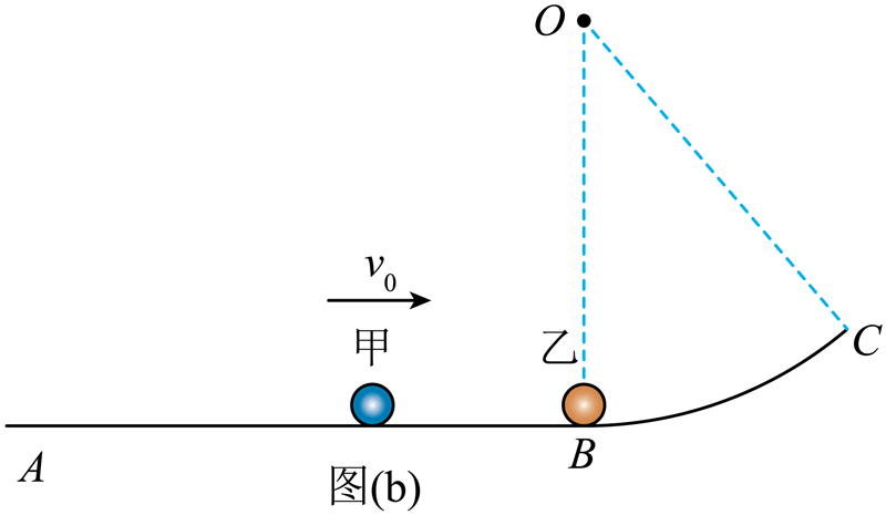 2.该同学模仿这个摆件,制作图(b)装置对其进行研究。光滑轨道 ABC 固定在竖直平面内,AB 段水平,圆弧轨道 BC 与之相切于 B 点,O 为圆心。甲、乙两球的质量分别为 m甲 = 0.1 kg、m乙 = 0.8 kg,乙球静置于 O 点的正下方,甲球以速度 v0 = 5 m/s 向右运动,与乙球碰撞后,以 3 m/s 的速度向左反弹。g 取 10 m/s2。