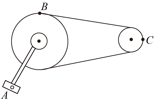 4.如图所示为自行车链条的传动装置,A、B、C 分别是踏脚板、链轮与飞轮边缘上的点,三者半径之比 RA∶RB∶RC = 3∶2∶1,则 A、B 两点的角速度之比 ωA∶ωB =_______,A、C 两点线速度大小之比 vA∶vC = _______。