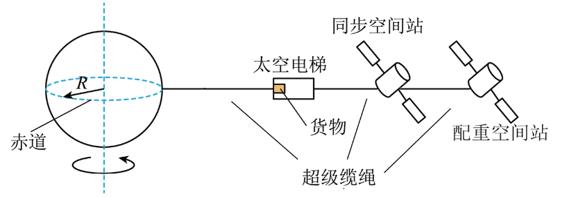 电影《流浪地球2》中太空电梯非常吸引观众眼球。如下图所示,是电影中太空电梯的示意图。太空电梯通过超级缆绳连接地球赤道上的固定基地、同步空间站及配重空间站,它们随地球以同步静止状态一起旋转。