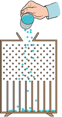 13.如图所示,用伽尔顿板演示统计规律时,让大量小球从上方漏斗形入口落下。重复多次实验后发现( )。