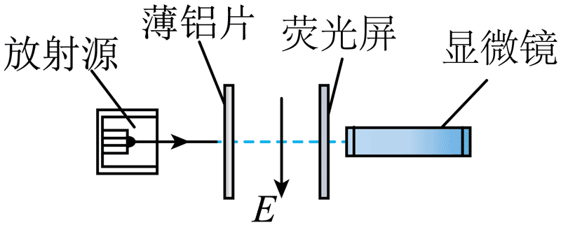 7.如图所示为研究某未知元素放射性的实验装置,实验开始时在薄铝片和荧光屏之间有图示方向的匀强电场 E,通过显微镜可以观察到在荧光屏的某一位置上每分钟闪烁的亮点数。若撤去电场后继续观察,发现每分钟闪烁的亮点数没有变化;如果再将薄铝片移开,观察到每分钟闪烁的亮点数大大增加,由此可以判断,放射源发出的射线可能为( )