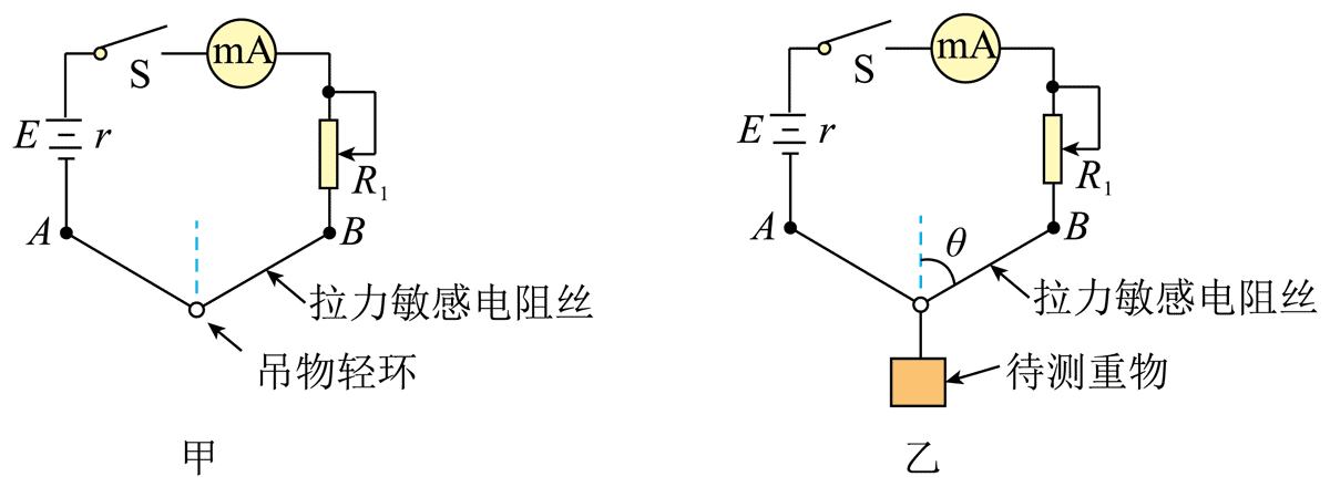 4.不吊重物时,闭合开关,调节 R1 使毫安表指针满偏的操作可视为吊秤的“调零”过程。调零结束后,保持 R1 滑片位置不变。接着在环下吊上重物,如图乙所示,已知电阻丝 B 端或 A 端每增加 1 N 拉力,其阻值将增加 0.5 Ω。则吊上重物之后,毫安表中电流的示数将________(选填“减小”、“不变”或“增大”),AB 两端电压将________(选填“减小”、“不变”或“增大”)。当毫安表示数为 5 mA 时,电阻丝对 B 端的拉力为________N。如果将毫安表盘作为重物质量表盘标上质量示数,则________侧质量示数更大(选填“左”或“右”)。