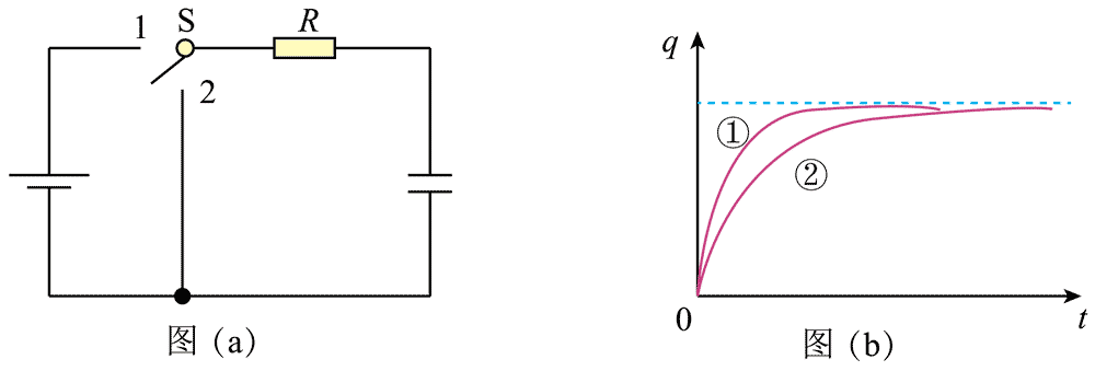 1.电容器能存储和释放电荷。用图(a)电路对电容器进行充放电实验,充电时应将单刀双掷开关 S 置于接线柱________。改变电路中电阻 R 的阻值对该电容器进行两次充电,对应电容器的电荷量 q 随时间 t 变化的 q – t 曲线分别如图(b)中①、②所示。对应快速充电过程的是图线________,对应电阻 R 阻值较小的是图线________。