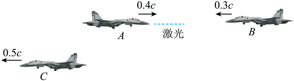 1.如图所示,飞船 A 向正对自己飞来的飞船 B 发出一束激光,同时飞船 C 正向远方飞去,在同一参照系中测得的飞船 A、B、C 的速率已在图中标出。