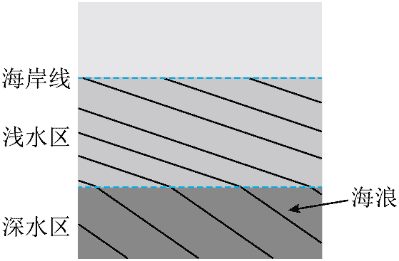 (2)海浪(波)在深水区和浅水区的传播速度不同,可将深水区和水区视作两种介质,波由深水区进入浅水区后传插速度减小,传播方向也发生变化,这是波的折射现象。
