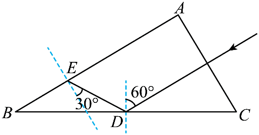 由于在 BC 边发生全反射,入射角为 60°,因此 n1 ≥ \(\frac{1}{{\sin 60^\circ }}\) = \(\frac{{2\sqrt 3 }}{3}\)