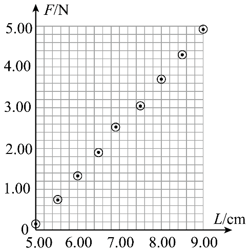 2.某同学准备自制一个弹簧秤,他把弹簧上端悬挂在一固定力传感器上(力传感器测量方向已调整至竖直)。未悬挂重物前用刻度尺测得弹簧自然下垂的长度为 5.00 cm,力传感器读数为 0.196 N。在弹簧下端悬挂不同质量的重物,待稳定后用刻度尺测量弹簧的长度 L,并记录相应的力传感器读数 F。