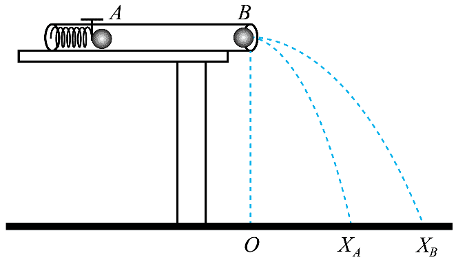 3.用图示装置验证动量守恒定律。固定在水平桌面上、内壁光滑的直玻璃管内有一压紧的弹簧,此时弹簧长度为 L,其右侧放置一小球 A。右端管口放置一小球 B,将弹簧释放后球 A 向右运动,与弹簧分离,与球 B 发生碰撞后两球从管口飞出。图中 O 点是小球从管口飞出点在水平地面上的垂直投影,XA 是球 A 落地点,XB 是球 B 落地点。测量 O、XA 两点间距离为 xA,O、XB 两点间距离为 xB,管口到地面的高度为 h。重力加速度为 g。