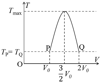 2.n mol 理想气体经过一个缓慢的过程,从状态 P 沿抛物线到达状态 Q,其 V(体积)–T(绝对温度)图如图所示。已知此过程中当 V = \(\frac{3}{2}\)V0 时,温度达到最大值 Tmax = \(\frac{9}{4}\frac{{{p_0}{V_0}}}{{nR}}\)(其中 p0 和 V0 分别是状态 P 的压强和体积,R 是普适气体常量)。若状态 P 和 Q 的温度 TP 和 TQ 都等于 \(\frac{{2{p_0}{V_0}}}{{nR}}\),则该过程的 p(压强)–V 图为( )