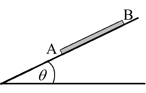 7.如图所示,一均匀金属长直细棒 AB 置于一倾角 θ = 36.9° 的粗糙斜面上。棒与水平面的夹角也为 θ。棒与斜面之间的静摩擦因数 μ = 1.00。当棒的温度缓慢升高时,该棒均匀伸长,但棒上有一处相对于斜面静止;此处离棒下端 A 的距离与棒总长之比为__________。当棒的温度缓慢降低时,该棒均匀缩短,但棒上有一处相对于斜面静止;此处离棒下端 A 的距离与棒总长之比为__________(保留三位有效数字)。假设斜面不受热胀冷缩的影响。